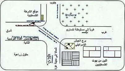 وتقابلت شابيرا مع ثلاثة جنود إسرائيليين مجهولين كانوا في الخدمة في موقع جيش الدفاع الإسرائيلي. وقال واحد منهم إنهم كانوا يعرفون أن شيئًا ما كان على وشك الحدوث، وذلك بسبب وجود عدد من طواقم الكاميرا التي قد تجمعت، وقالت شابيرا إن عشرة على الأقل من المصورين الفلسطينيين وأطقم التصوير الذين يعملون في وكالات الأنباء الغربية تجمعوا عند التقاطع.[41] وبدأ الوضع يتصاعد في منتصف النهار. وقال أحد الجنود إن النار الحية أطلقت من جهة الكتل الفلسطينية الشاهقة التي تعرف باسم"التوأمين"- انظر إلى الربع السفلي على الجانب الأيمن من هذه الصورة. وقال الجندي إن الرصاص كان يطلق على موقع جيش الدفاع الإسرائيلي، وأضاف أنه لم ير آل الدرة.[79] ورد الإسرائيليون على ذلك بإطلاق النار على محطة فلسطينية تقع على بعد 30 مترًا على يسار الدرة ووالده؛ وقال الجندي إنه تم تجهيز أسلحتهم بالبصريات التي مكنتهم من إطلاق النار بدقة.[80] ويرى الجندي أن إطلاق النار لم من قبيل الصدفة، وذلك لأن المسافة كانت قريبة جدًا، وكانت الرؤية واضحة للغاية، ولكن لم يطلق النار بداية من الموقع الإسرائيلي.[81]