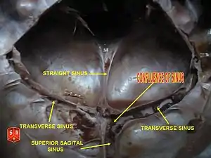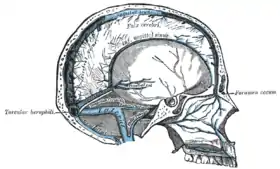 ![]() القسم السهمي من الجمجمة، والتي تبين الجيوب الجافية. (وصفت ب "معصرة هيرفيل".) القسم السهمي من الجمجمة، والتي تبين الجيوب الجافية. (وصفت ب "معصرة هيرفيل".) | |