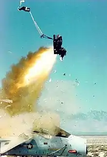 اختبار مقعد قذفي لطائرة إف - 15 إيغل تابعة للقوات الجوية الأمريكية.