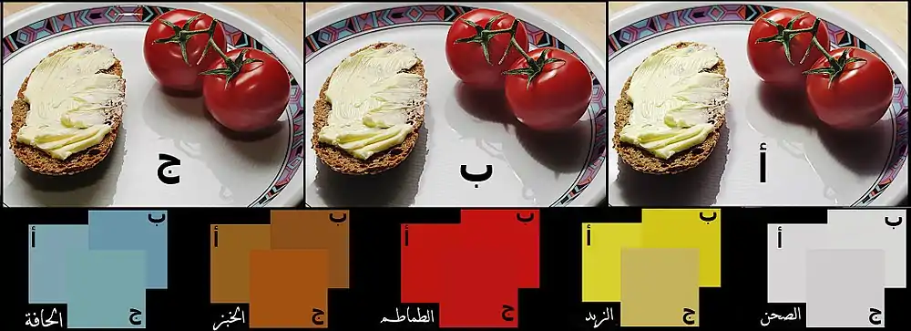 التقاط نفس المشهد باستخدام ثلاثة مصادر ضوئية مختلفة؛ مصباح فلوري مدمج (أ)؛ مصباح توهج هالوجيني مرتفع الجهد (ب)؛ ضوء فلاش (ج).