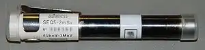 - مقياس الجرعة في شكل القلم : يوضع في الجيب. يشحن بشحنة كهربية تخزن في مكثفة، وتقل شحنة المقياس إذا تعرض للإشعاعات المؤينة. وتؤخذ القراءة عن طريق سلك داخله يتحرك على تقسيمات. ويمكن إرجاع السلك إلى وضع الصفر وذلك بشحن المقياس من جديد.