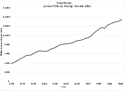 في عام 2018، بلغ إجمالي استهلاك الطاقة في العالم 13864.9 مليون طن نفط مكافئ (161249 تيراواط ساعة)،[5] أي ما يعادل متوسط استهلاك قدرة يساوي 18.40 تيراواط أو 0.73 على مقياس كارداشيف المُوسع من قبل ساجان.