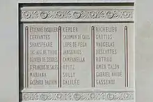 أنشئت المكتبة في العام 1851 من قبل المهندس المعماري هنري لابروست. جعلت بواجهات قليلة النوافذ، لكي يحفروا على جدرانها أسماء العظماء الذين أثروا في الثقافة البشرية عند كل الشعوب، لذلك نجد أسماء شخصيات عربية بارزة محفورة فوق بابها، أبرزهم: الرسول محمد، الفارابي، الرازي، الحلاج وأسماء عربية أخرى إلى جانب نيوتن، ريشليو وعظماء غيرهم. وكأن بانيها أراد أن ينقش أسمائهم مقابل مقبرة العظماء في باريس، حيث يرقد عظماء فرنسا. كل هذه الأسماء رتبت حسب الترتيب الزمني إلى العصر الحديث.