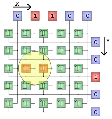 طورت مصفوفات حساسات تحسب موضع النقطة المضاءة بطريقة متوازية بغرض التطبيقات السريعة .ويمكن مقارنة شدة إضاءة خلايا البيكسل إما لأسطر البيكسل (الاتجاه X ) أو صفوفها (الاتجاه Y) ومقارنتها بمرجع ضوئي. وتتم مقارنة نتائج المصفوفات السطرية أو الصفوف بدارة إلكترونية منطقية OR . ومن جميع الأسطر والصفوف التي تحوي خلية ذات إضاءة أشد من الإضاءة المرجعية (في الصور باللون البرتقالي) تحسب إحداثيات البقعة الضوئية.