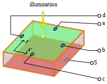 يكون القطب السطحي ذو مقاومة كهربائية عالية نسبيا .[1] وعندما نسقط على سطح الديود شعاعا ضوئيا نقطيا (أصفر في الصورة) ينشأ تيار في من منطقة النقطة الضوئية يتوزع بحسب موضع النقطة الضوئية بنسب متناسبة مع المسافة التي يقطعها إلى الأقطاب الموجودة على الجوانب . من التيارات و و و حساب احداثيات موضع النقطة الضوئية من المعالات التالية: