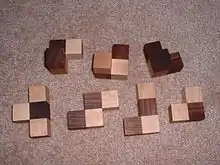 قطع مكعب سوما السبعة مفككة.