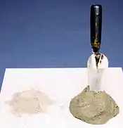 وعندما يُطحن جيداً ويُخلط مع الجير فإنه يصبح كالإسمنت البورتلاندي ويصنع ملاط قوي يستطيع أيضا أن يتجمد تحت الماء.