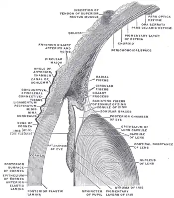 1. الخلط الزجاجي 2. الحاشية المشرشرة 3. العضلة الهدبية 4. النطيفة الهدبية 5. قناة شليم 6. الحدقة 7. الغرفة الأمامية 8. القرنية 9. القزحية 10. قشرة العدسة 11. العدسة 12. النواتئ الهدبية 13. الملتحمة 14. العضلة المائلة السفلية 15. العضلة المستقيمة السفلية 16. العضلة المستقيمة الوسطى 17. أوردة وشرايين الشبكية 18. القرص البصري 19. الأم الجافية 20. شريان الشبكية المركزي 21. الوريد الشبكي المركزي 22. العصب البصري 23. الأوردة الدوارية 24. غمد المقلة 25. بقعة الشبكية 26. النقرة المركزية 27. بياض العين 28. المشيمية 29. العضلة المستقيمة العلوية 30. الشبكية