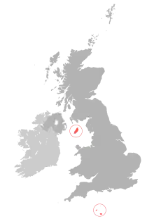 خارطة مواقع تبعيات التاج البريطاني: جزيرة مان في البحر الأيرلندي، وجزيرتي جيرزي وغيرنزي (جزر القنال الإنجليزي) في بحر المانش.
