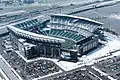 صورة للملعب ممتلئ بجماهير فريق فيلاديلفيا إيغلز خلال مباراة فريقهم في ليلة ممطرة.