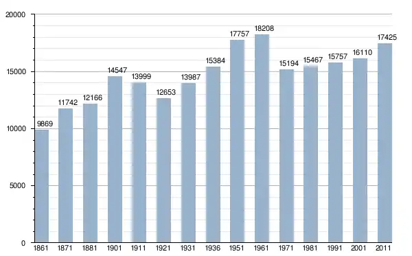 في سنة 1861 بلغ عدد السكان 9٬869 نسمة، وتطور العدد ليصل في سنة 2011 لـ 17٬425 نسمة.