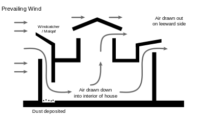 - مسارب الهواء العادم المعاكسة للرياح السائدة، تستخدم لسحب الهواء الساخن من الحجرات إلى الهواء الخارجي الذي يحل مكانه الهواء الرطب القادم من الفناء.