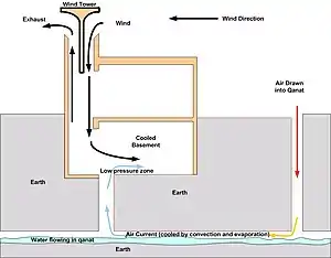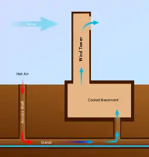 - ابراج التهوية، هو برج مربع ينقسم من الداخل إلى اربعة ابار تهوية راسية بواسطة حائطان متعامدان وميوازيان الجدران الخارجية. يدخل الهواء من بئرين مواجهين للريح وفي نفس الوقت يخرج الهواء الساخن عن طريق البئرين الأخرى ن.