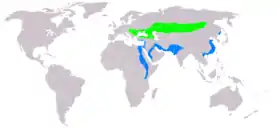![]() ملكة العقبان (الأخضر الفاتح) المناطق المتداخلة، (الأزرق) فصل الشتاء. ملكة العقبا الإسبانية (الأخضر الداكن) توزيع (الأنواع المستقرة). | |
