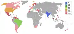 | إنقطاع عن | أستراليا, النمسا, بوليفيا, كولومبيا, ليبيريا, نيكاراغوا, بيرو, رودسيا, تونس, الأوروغواي |