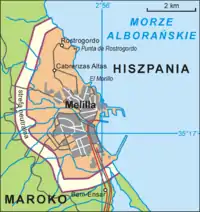 مليلية هي مدينة مغربية تحت السيادة الإسبانية، تقع على القارة الأفريقية قبالة الساحل الجنوبي لشبه الجزيرة الإيبيرية. تحيط بها الأراضي الريفية المغربية من كل الأطراف، تحدها من الشرق والشمال الشرقي البحر الأبيض المتوسط، يبلغ عدد سكان مليلية 78.476 نسمة (وفقا لإحصائيات التعداد السكاني المؤرخ 1 يناير 2011)، وتبلغ مساحتها 12,3 كم مربع (معدل الكثافة السكانية 5.972 نسمة/كم²). يتألف سكانها من المسيحيين (65%)[6] ومن المسلمين (35%)، مع وجود أقلية يهودية وهندوسية. وقد أصبحت المنطقة منذ عام 1995 تتمتع بصيغة للحكم الذاتي داخل إسبانيا بقرار البرلمان الإسباني عام 1995.