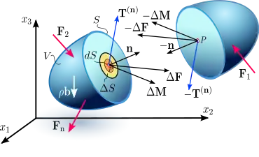 عندما يتعرض الجسم لقوى خارجية من نوع قوى السطح أو قوى الاتصال ، باتباع معادلات أويلر للحركة ، تنتقل قوى الاتصال الداخلية والعزم الدوراني من نقطة إلى أخرى في الجسم، ومن شريحة إلى أخرى عبر السطح الفاصل بسبب التلامس الميكانيكي لجزء من المادة المتصلة على الآخر (الشكل 2.1a و 2.1b). على عنصر مساحة محتوي ، مع متجة عمودي ، توزيع القوة مكافئ لقوة التماس عند النقطة P والعزم الدوراني السطحي
