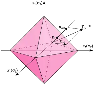 وهو متوسط الإجهاد الهيدروستاتيكي. هذه القيمة تكون متساوية في جميع مستويات ثماني السطوح الثمانية. إجهاد القص على مستوى ثماني السطوح يكون كالتالي: