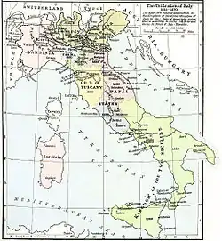 كان إنشاء مملكة إيطاليا نتيجة لجهود متضافرة من القوميين الإيطاليين والملكيين الموالين لعائلة سافوي لتأسيس مملكة متحدة تضم كامل شبه الجزيرة الإيطالية. بعد ثورات عام 1848، كان هنالك زعيم لحركة التوحيد الإيطالية وهو الثوري جوزيبي غاريبالدي. وكان له شعبية بين الإيطاليين. كان غاريبالدي الإيطالي المحرك الجمهوري للتوحيد في جنوب إيطاليا، على الرغم من أن المملكة ليس لديها اتصال فعلي إلى روما، كانت المملكة قد نجحت في تحدي النمسا في الحرب الثانية الإيطالية لاستقلال وتحرير لومبارديا فينيتو من الحكم النمساوي. المملكة كما أنشأت تحالفات هامة التي ساعدت على تحسين إمكانية توحيد إيطاليا، مثل بريطانيا والإمبراطورية الفرنسية الثانية في حرب القرم. وسردينيا تعتمد على فرنسا على حمايتها. وفي العام 1860، اضطرت سردينيا للتنازل عن الأراضي إلى فرنسا للحفاظ على العلاقات، بما في ذلك مسقط غاريبالدي نيس.