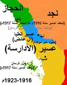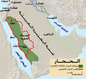 ![]() مملكة الحجاز باللون الأخضر، وحدود الحجاز الطبيعية بالأحمر | ||||||