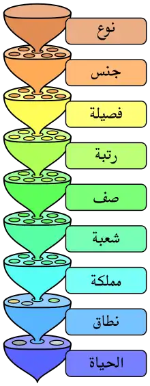 | المملكة | مملكة البكتيريا البدائية | مملكة البكتيريا الحقيقية | مملكة الطلائعيات | مملكة الفطريات | مملكة النباتات | مملكة الحيوانات |