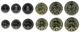 - "Turkmenistan's 5000 manat to equal 1 manat after denomination". 2008-09-06. مؤرشف من الأصل في 03 مايو 2018. الوسيط