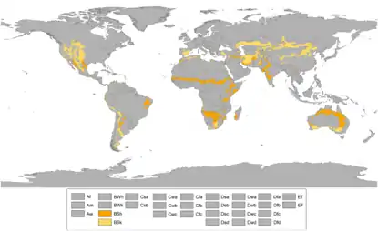 يشيع تواجد المناخ شبه القاحل الحار حول المناطق المحاذية للصحاري المدارية. ويتواجد في أفريقيا، أستراليا وجنوب آسيا. في أستراليا وجنوب آسيا، معظم المناطق المحيطة بمناطق الصحراء الوسطى تنتمي إلى النظام شبه القاحل الحار.[4]