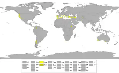 تحت تصنيف كوبن للمناخ، المناخ المتوسطي الحار (ذو الترميز Csa) ومناخات "الصيف المعتدل الجاف" (ذات الترميز Csb) غالبا ما ترمز للـمناخ المتوسطي. تمتاز المناطق المعتدلة (أو مناطق C) بدرجات حرارة أعلى من الصفر، لكن أقل من 18° مئوية خلال الأشهر الباردة. الحرف الثاني يعطي كمية التساقطات (s يمثل الصيف الجاف). عرف كوبن الشهر الصيفي الجاف على أنه ذو تساقطات أقل من 30 مم، وأحيانا 40 مم.[2][3] الحرف الثالث يبين درجة سخونة الصيف: