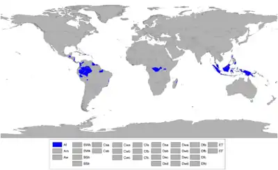 للغابات الإستوائية نوع من المناخ المداري حيث لا فصل جاف، كل الشهور لها معدل تساقطات أكثر من 60 مم لكل شهر. لا وجود للصيف أو الشتاء بالغابات المطيرة، الجو عادة حار ورطب طوال السنة مع تساقطات قوية وكثيفة ومتكررة. كل يوم يمكن أن يشبه الآخر في هذا المناخ، ويمكن أن يكون المدى الحراري اليوم بين النهار والليل متغايرا أكثر من ذلك الذي يحدث على مدار السنة.[1]