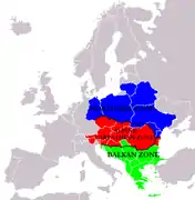- بلغاريا، اليونان، ألبانيا، كوسوفو, [lower-alpha 1] مقدونيا الشمالية، البوسنة والهرسك، مونتينيغرو