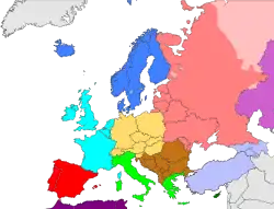 - أوروبا الشيوعية (الكتلة الشرقية), أوروبا الرأسمالية (الكتلة الغربية): تلك الأجزاء الموجودة على جانبي الستار الحديدي ودول العالم الثالث (المحايدة وغير المنحازة خلال الحرب الباردة).
