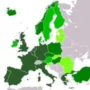 - النمسا، بلجيكا، بلغاريا، كرواتيا، قبرص، جمهورية التشيك، الدنمارك، إستونيا، فنلندا، فرنسا، ألمانيا، اليونان، المجر، أيرلندا، إيطاليا، لاتفيا، ليتوانيا، لوكسمبورغ، مالطا، هولندا، بولندا، البرتغال، رومانيا، سلوفاكيا، سلوفينيا وإسبانيا والسويد.
