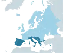- ألبانيا، البوسنة والهرسك، بلغاريا، كرواتيا (النصف تقريباً), اليونان، كوسوفو, [أقل ألفا 1] الجبل الأسود، مقدونيا الشمالية، رومانيا (منطقة دوبروجا), صربيا، سلوفينيا (القسم الساحلي) وتركيا (شرق تراقيا)