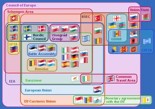 - منطقة بلا حدود تم إنشاؤها بموجب اتفاقيات شنغن، بما في ذلك: