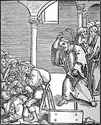 المسيح يطرد المرابين من المعبد، نقش خشبي لـلوكاس كراناتش الأكبر في قصص المسيح وأعداء المسيح.