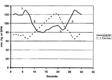- يُعيق ازدياد الضغط داخل الصدر عودة الدم المنتظمة إلى القلب فينخفض نتاج القلب ويقلّ حجم النفضة. يمكن رؤية ذلك على التخطيط المقابل في الفترة من 5 إلى حوالي 14 ثانية.