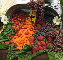 وتتضمن فاكهة الصيف بعض أنواع العنبيات مثل (العليق الشجري، والتوت الأزرق، والعليق) والفاكهة ذات النواة مثل (الخوخ، والدراق، والمشمش) بالإضافة إلى البطيخ بأنواعه. وعن خضراوات الصيف فإنها تشمل الشمندر، والذرة، والخيار، والباذنجان، والفاصوليا الخضراء، والطماطم والكوسا.