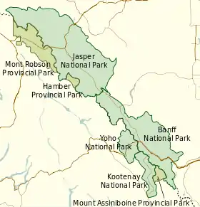 تتضمن المتنزهات جبال،مثلجات،ينابيع حارة كما تتضمن منابع الأنهار الرئيسية في أمريكا الشمالية من ضمنها: