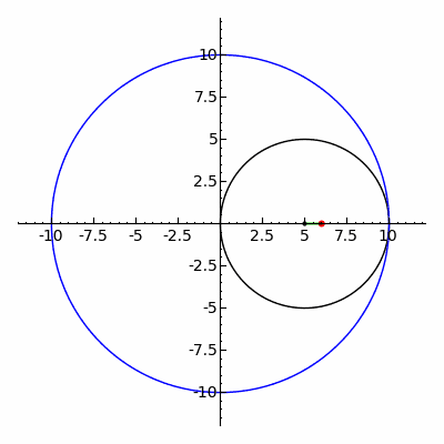 المنحنى الأحمر هو منحنى عجلي تحتي يتولد بتدحرج الدائرة الصغرى السوداء حول المحيط الداخلي للدائرة الكبرى الزرقاء (المعاملات هي R = 5, r = 3, d = 5).