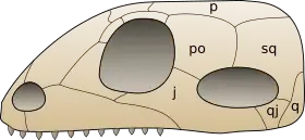يعود تسمية مجموعة مندمجات الأقواس إلى تقب الجمجمة الذي يحيطه العظام : "جوجال" J و "كوادراتوجوجال" qJ و "سكاموسوم" sq و "بوست أوربيتال" po (أنظر الشكل). ويوجد الكوادرتوجوجال بهذا الحجم في البليكوصورات الأصلية، ويوجد صغيرا في البليكوصورات العليا، وتغطي عظمة السكاموسوم الجزء الخلفي للفتحة بالكامل.