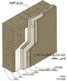 اهتمام خاص في عزل الجدران: الواح الصوف الصخري Rockwool بسمك 24 سم مثبتة على الجدار الداخلي بعد ذلك تُشيد الطبقة الخارجية للجدار.