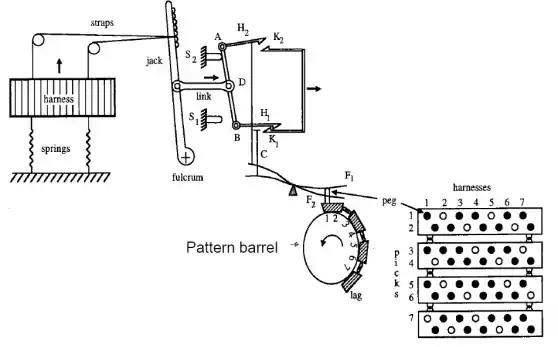 يبين الشكل الجانبي مبدأ العمل من أجل التحكم بدرأة واحدة. السكينتان K1، K2المتصلتان بمحور الدوبي، ويستمد هذا الأخير حركته من محور محرك آلة النسيج عن طريق مخفض سرعة بنسبة 2\1 تتحرك هاتان السكينتان حركة ترددية (ذهاب وإياب). يمكن أن توصل كل درأة إلى السكينتين عن طريق الذراعين الظفريين H1، H2 يقوم الذراعان C،D بالتحكم بالذراعين الظفريين تبعاً للمعلومات الواردة من جهاز قراءة ذاكرة الدوبي. وظيفة المسندين S1،S2 هي تحديد حركة نهايات الذراع AB.