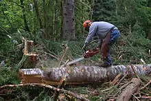 - القطع - الهدف هو سقوط الشجرة بأمان لتقطيعها وتقطيع أخشابها. ويشمل هذا اعتبارات الميل والانحناء والرياح والفروع والعقبات وحمل الثلج وأضرار قد تلحق بالشجرة. والهدف من ذلك هو تجنب سقوط الشجرة على شجرة أو عقبة أخرى. وبعد تقطيع جذع الأشجار وتحديد اتجاه التقطيع؛ يصبح القطع صحيحًا بثلاث عمليات تقطيع رئيسية. وللتحكم في السقوط، تتم عمليات التقطيع من الأعلى ومن الأسفل حتى الوصول إلى مفصل إسفيني بـ 45 درجة في اتجاه خط القطع. ومن الجانب الآخر من الإسفين، يُجرى القطع أفقيًا وأعلى قليلاً فوق القطع السفلي. وعندما يكون المفصل في المكان السليم، سيبدأ سقوط نتائج عملية القطع في المكان المطلوب.[10] ويحدث التوقف عندما تتحرك الشجرة للخلف عكس الاتجاه المقصود. وقد يمنع وضع الإسفين التوقف من قرط المنشار.