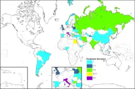 خريطة جغرافية تظهر دول العالم حسب عدد المناطق الاقتصادية الحرة (FEZ)، وهي أحد أنواع المناطق الاقتصادية الخاصة (SEZ).