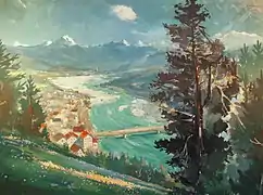 جِسراً وزُهُور ومَلمحاً لبَلدة؛ لِزَائِرٍ تَرَك لهَا أَثراً. لَوحة للرَّسَّام هيلموث إيلغارد مِن العَام 1951م يصوِّر فِيها إِحدَى بَلدات مِنطقة بَاد تُولتس ڤولفراتسهاوزن.
