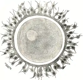 ![]() بويضة الإنسان: تَظهر المَنطقة الشَفافة كَحزام واضح سميك مُحاط بخلايا الإكليل المُتشعع. | |