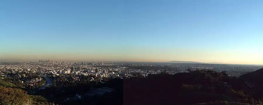 منظر لحوض لوس أنجلس من جنوب مولهولاند درايف (Mulholland Drive). من اليسار إلى اليمين يمكنك رؤية جبال سان غابرييل على مد البصر، ويست هوليووود في وسط لوس انجلوس. سانتا مونيكا، والمحيط الهادي.