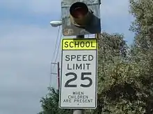 حدود السرعة في المناطق المدرسية عادة تكون بين 15-25 ميل في الساعة (25 - 40 كيلو متر في الساعة).