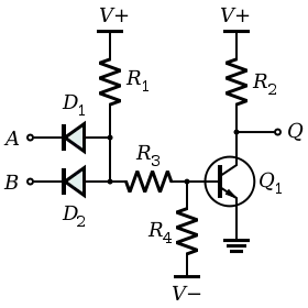 في الدوائر المتكاملة، يقوم ثنائيان محل المقاومة R3 لمنع أي تيار قاعدة أثناء وجود مدخلين أو أكثر في مستوى منطقي منخفض. كذلك تم الاستغناء عن المقاومة. R4 كما أن الدارة المتكاملة تعمل على مصدر تغذية واحد.[2]