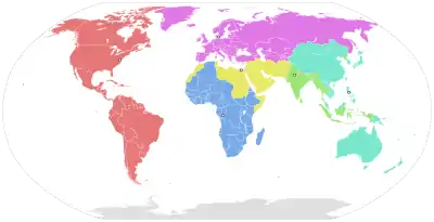 | جنوب شرق آسيا | نيودلهي، الهند | معظم دول جنوب شرق آسيا، باللإضافة إلى كوريا الشمالية.[16] | SEARO |